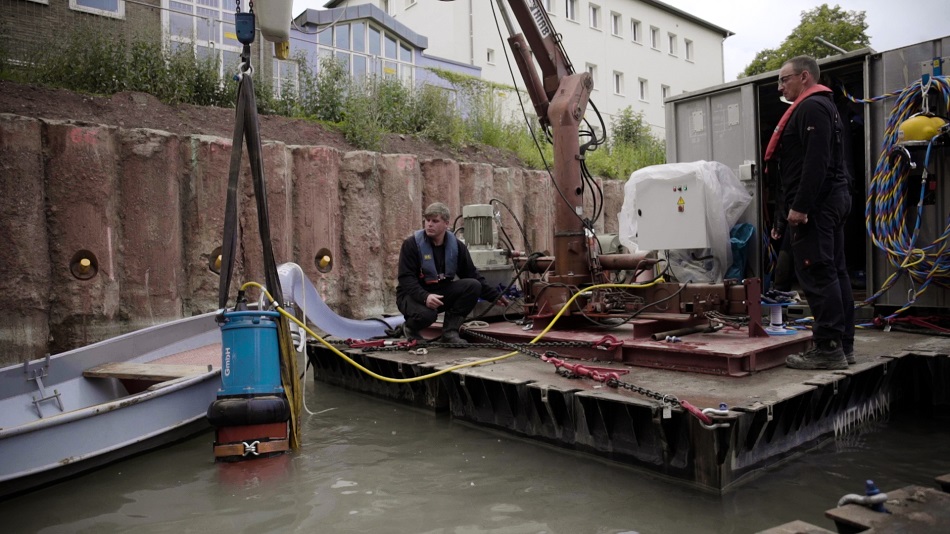 hey have even proved themselves with water containing bentonite. There is not much choice on the market, says Meyer, because pumps for this work not only have to withstand the difficult medium, but also have to have a long service life. While the concrete floor is scheduled to be constructed for around 30 hours at a stretch, two and a half months are estimated just for the preparatory suction work. The divers manage 9 to 10 hours a day.