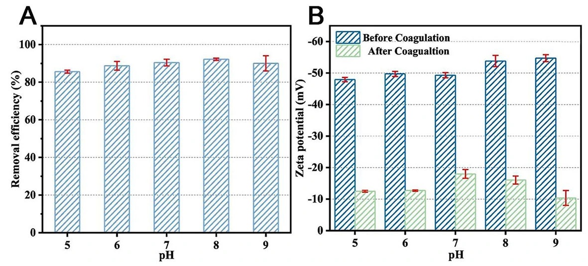 Adding synthetic or natural polymers to water during flocculation helps settle unstable particles of MPs by fusing with a flocculant to form bigger microflocs. Various inorganic flocculants can remove MP particles by compressing the electric double layer (EDL). However, the low removal efficiency of MPs was reported with common coagulants due to variations in size, density, and shape, as well as inadequate coagulant hydrolysis. According to Ma et al. (2019), the removal efficiencies of FeCl3·6H2O and AlCl3·6H2O coagulants were below 12.7% and 36.9%, respectively, for polyethylene (PE) particles with a size range of 0.5-5 mm. Recent research by Zhang et al. found that Al2(SO4)3 had a removal efficiency of less than 2% for MPs (PE and PS) (180 nm - 125 μm).