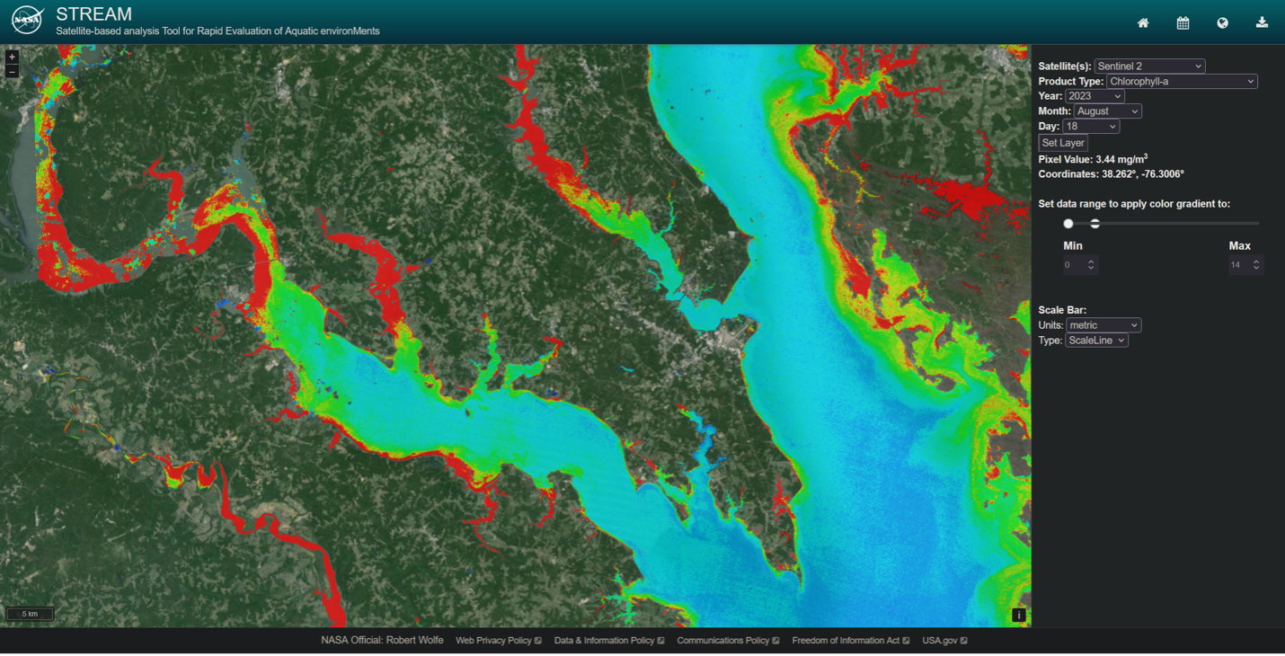 STREAM allows users to visualize water quality maps, identify pixel values, and view time-series plots for specific regions, enabling low-latency detection (under six hours) of water quality anomalies. It offers insights into chlorophyll-a concentrations, Secchi disk depth (water transparency), and total suspended solids (TSS). The satellite images, sourced from the USGS Landsat Project and the Copernicus Open Access Hub, are processed through two independent machine-learning streams. STREAM also integrates tools from NASA’s near real-time data systems, notably the Fire Information for Resource Management System (FIRMS).
