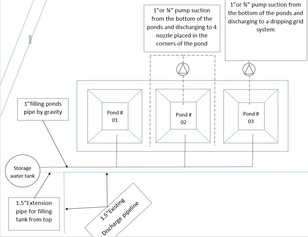 The idea was to construct three evaporation ponds, one as reference pond, and a second one equipped by sprinkles and spray system and a third one equipped by a dripping grid system to improve the evaporation rate. We put a storage tank for reject brine, which comes from MEDRC RO Pilot Plant. MEDRC RO Pilot Plant is a two pass plant with a production capacity of 3 m3/h. It has been specially designed to fit with hands on training needs in operation, monitoring and troubleshooting. The brine stored at the tank and pumped in the evaporation ponds has a salinity value of salinity conditions 30,000 ppm.
